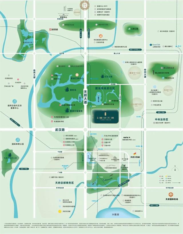 由于与天府CBD仅隔一条武汉路,项目在坐拥麓湖公园区城市配套的同时,也能轻松享受CBD的城市配套群。从麓湖美食岛、麓坊中心、600亩麓湖商业水镇、伊藤洋华堂,到天府大悦城旗舰店、雪莲堂美术馆、天府国际保税购物中心,到华西天府医院、万达UPMC国际医院,再到领先整个天府新区的C区教育配置……很多大型的配套已经纷纷呈现,或正处于紧锣密鼓建设之中。可以说,天健·麓湖天境所拥有的交通、教育、医疗、购物、休闲、文化配套,都是天府新区顶尖、乃至是成都最好的!