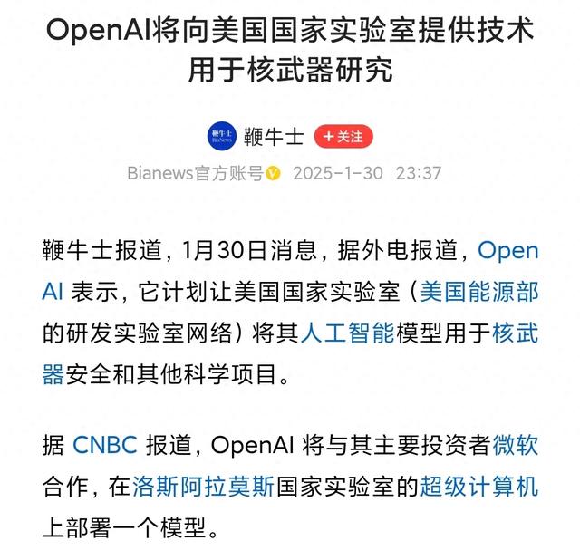 这两天啊,OpenAI又搞了个大动作,宣布要和美国国家实验室合作,拿他们最新的人工智能模型,来搞核武器安全研究。听着好像很高大上啊,什么“降低核战争风险”“确保全球核材料安全”之类的听起来就像是救世主一样,但细想一下,这事儿真是这么简单的吗?