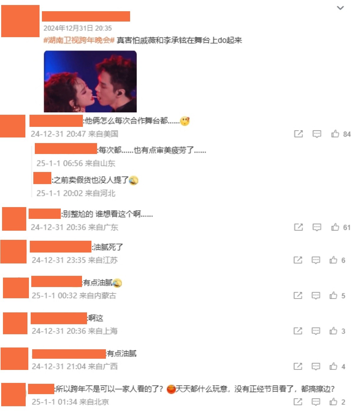 戚薇和李承铉的出现让观众感到有些不适。他们的表演过于大胆。在这样一个众人展示才艺的跨年夜舞台上,他们却表演了让人尴尬的节目。无论是亲密的舞蹈还是营造的暧昧气氛,都让人感到不自在。