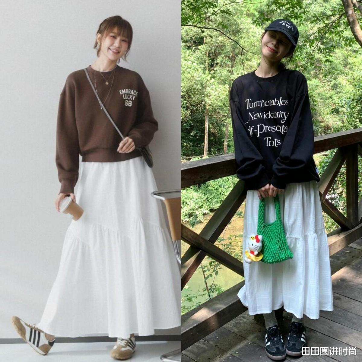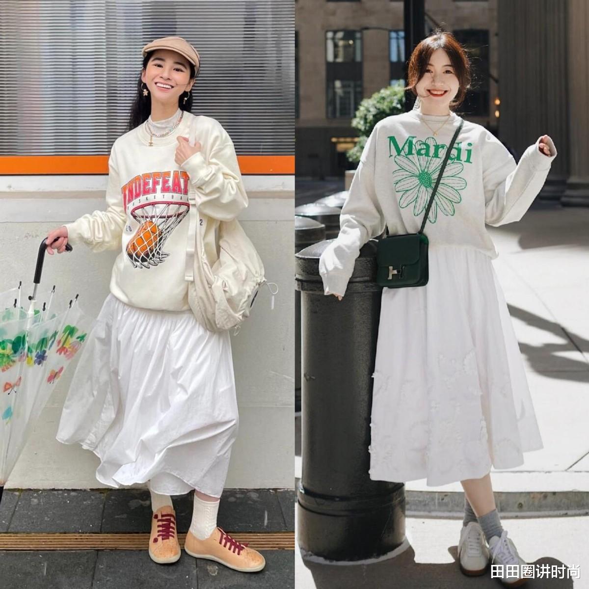 卫衣风格休闲,如果你穿腻了牛仔裤,来试试搭配初恋半身裙吧,这种穿法属于混搭,时髦度会更高,也不容易烂大街,还可以降低卫衣的臃肿感哦。