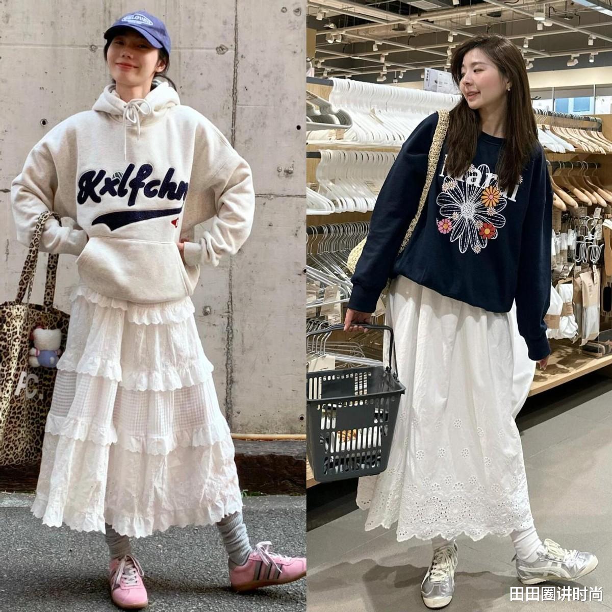 宽松型的卫衣,穿在身上松弛感十足,再搭配温柔的蛋糕初恋裙,增加层次感的同时也显得特别温柔,脚下搭配平底德训鞋,可以和卫衣呼应,整体搭配舒适时髦并存,很适合平时出街穿。