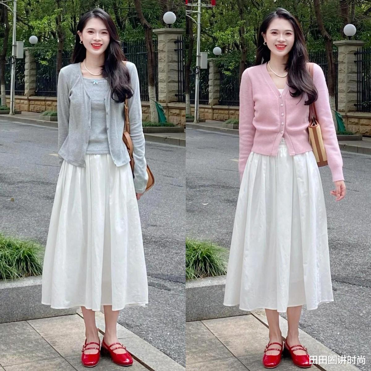 例如这些修身的短针织衫,穿在身上非常显瘦,搭配宽松的白色初恋裙,松紧结合可以显瘦,再结合红色的平底单鞋,更加有女人味。