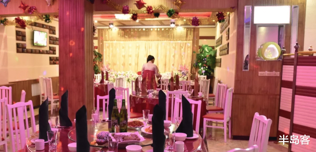 我们在朝鲜的第二天时间,进一家餐馆以后,还以为自己跑错地方了,因为里面的布置非常的喜庆,就像是有人要举办婚宴一样。屋顶还挂有一闪一闪的灯光。餐馆内的颜色以粉色为主。周围也摆满了很多鲜花,服务员穿着朝鲜的民族服装,靓丽动人。
