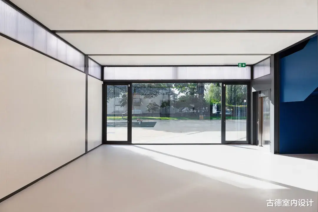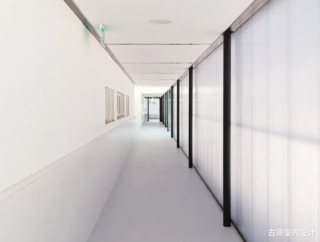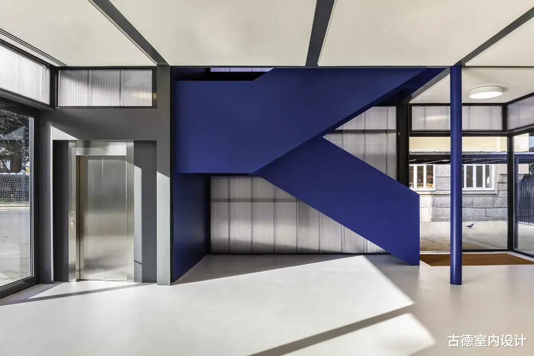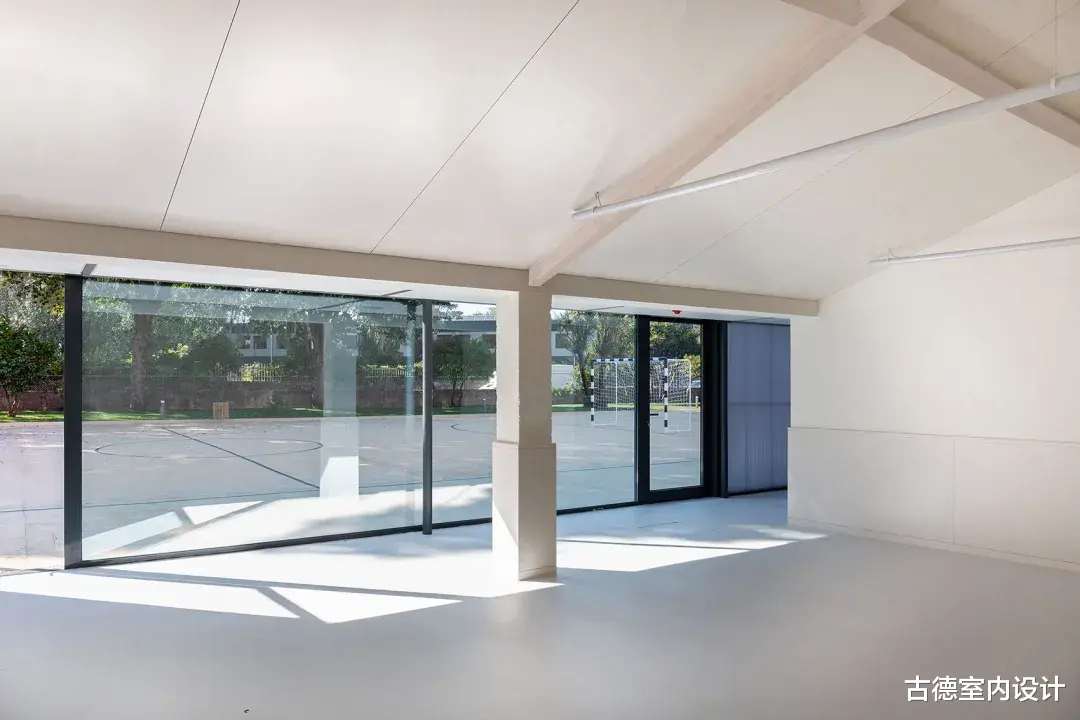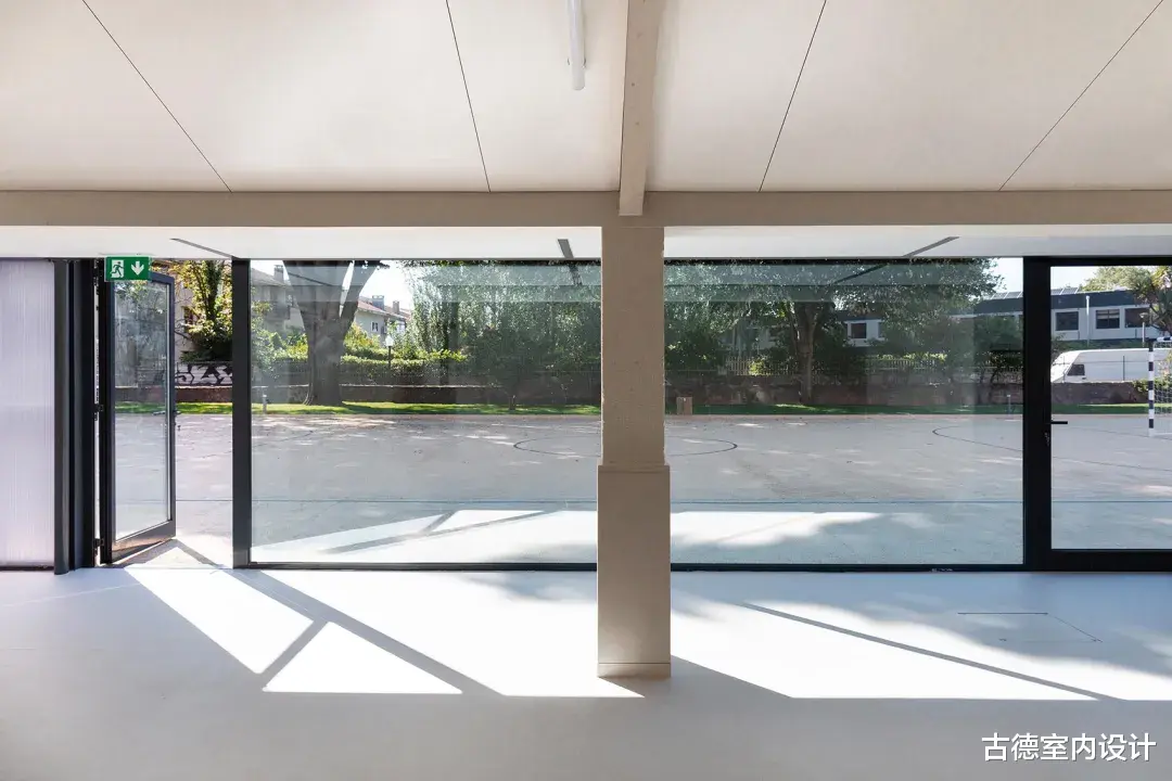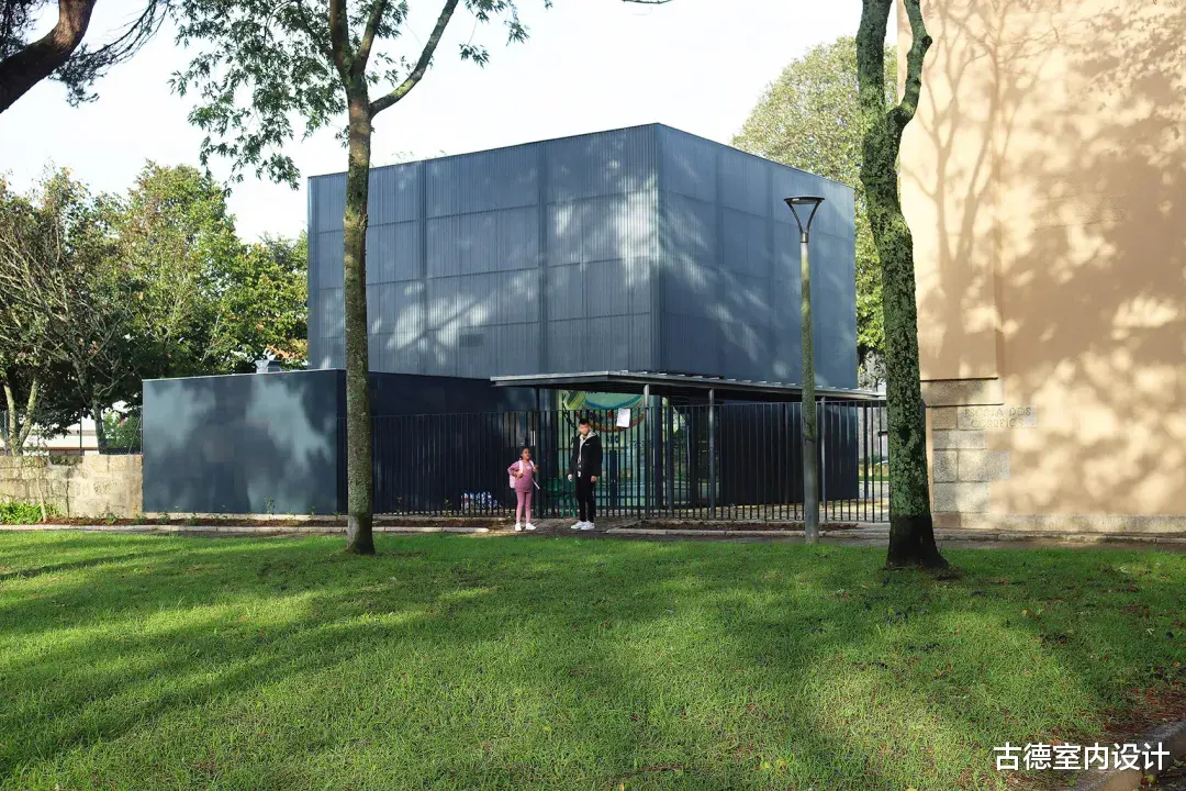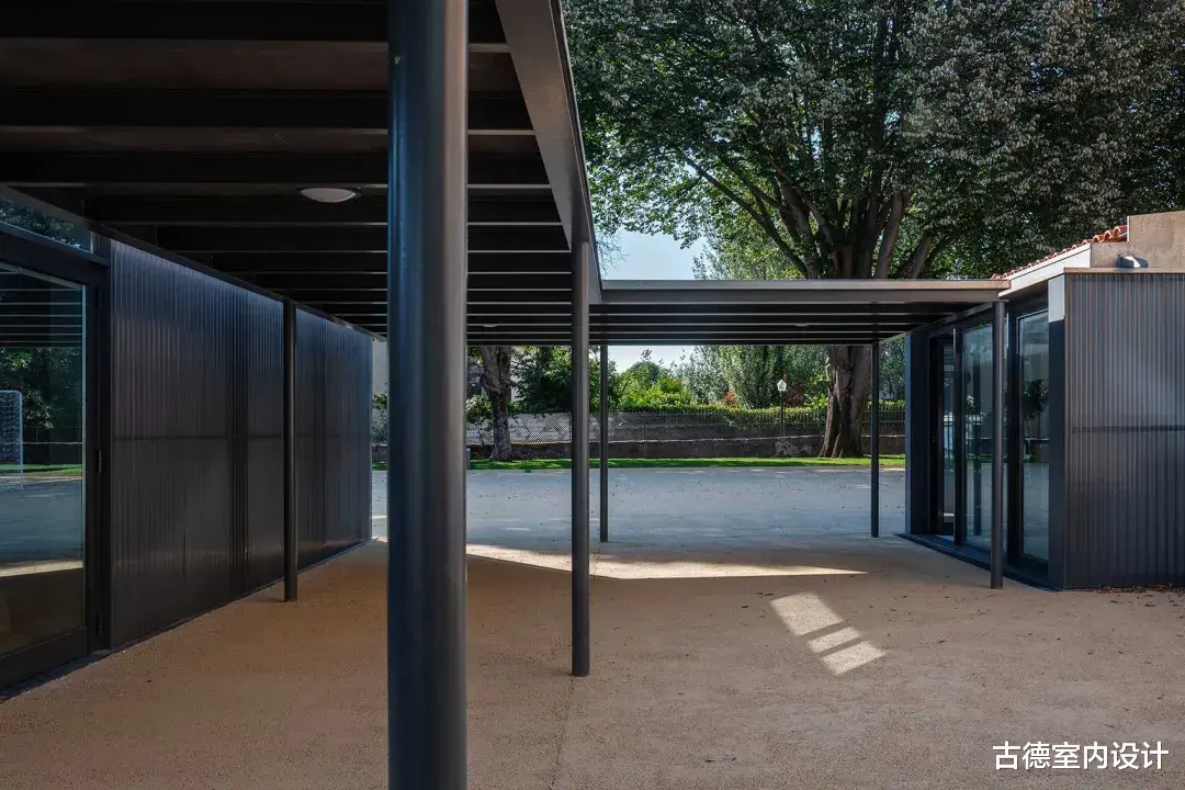 ▲修复后立面©António Ataíde在对教室、公共区域和流通空间进行精心翻修的同时,新的建筑体量变得独立,与原有建筑的阅读空间对峙并相互影响,将穿孔波纹金属板表皮延伸至学校的新走廊。该项目规定建造有顶棚的操场和一条内部通道,将楼梯和教室这两个原有的中心连接起来,到目前为止,这两个中心只能从外部连接。两者之间的空间界定了学校的新入口,树梢点缀着操场,既是操场的延伸,又是操场的背景。