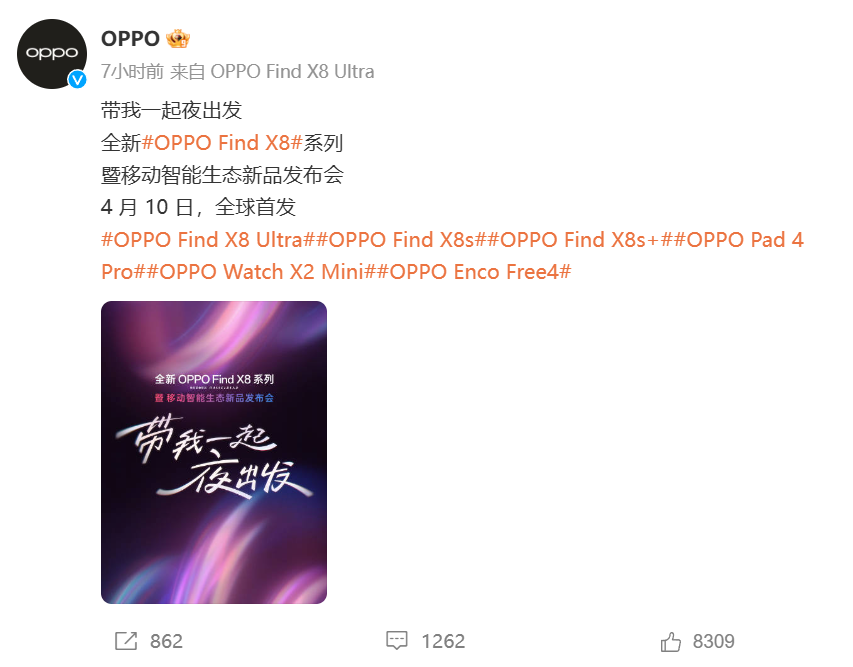 O粉应该等这个新品发布会等了很久了吧?OPPO官宣了全新OPPO Find X8系列暨移动智能生态新品发布会将于4月10日举行,到时候他们将会给我们带来Find X8系列新品,还有一系列IOT产品,OPPO Pad 4 Pro平板,OPPO Watch X2 Mini手表,还有OPPO Enco Free4耳机都会跟我们见面,看来OPPO这次是蓄了多个大招。