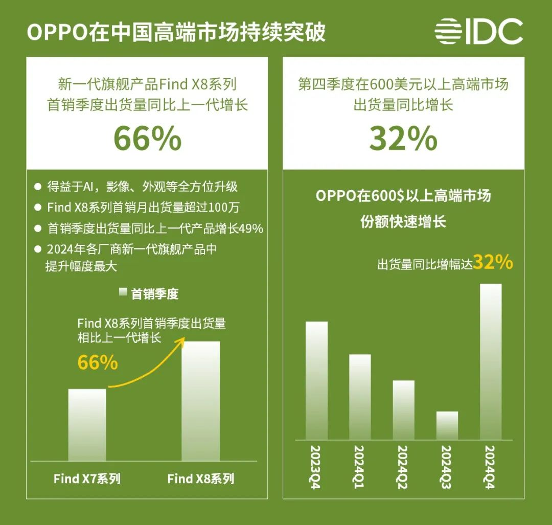 从种种迹象来看,OPPO的新品手机都具备爆款的潜质,而此前发布的Find X8系列新品,其实就已经在销量方面一路长虹。该机首销季度出货量同比上一代增长66%,首销月出货量超100万,首销季度出货量同比上一代产品增长49%,成为2024年各厂商新一代旗舰产品中提升幅度最大的产品。由于Find X8系列的出现,OPPO在第四季度600美元以上高端市场的出货量同比增长32%,市场份额快速增长。