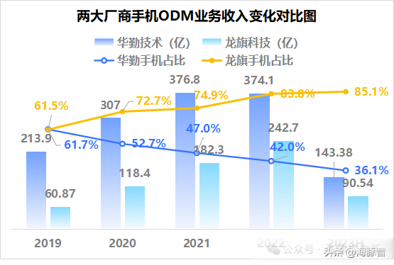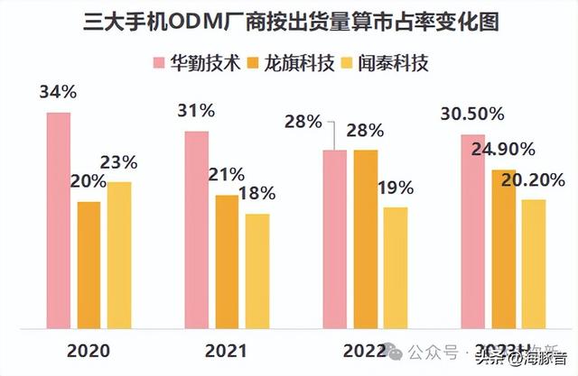 且在华勤技术手机ODM业务停滞不前的时候,龙旗科技手机ODM业务则在2020-2022年收入增速迅猛,2年实现了翻倍增长,全球市占率按出货量算从2020年的20%小幅提升至2023年上半年的30.5%,并超过华勤技术、闻泰科技跃居第一位