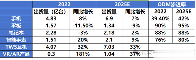 2022年智能手机ODM出货量为4.83亿台,但渗透率较低仅为39%,预计到2025年将增至6亿台以上,渗透率将提升至2024年的42%。未来印度、拉丁美洲、中东非等新兴市场出货将持续增长,而且出货产品正是ODM厂商主流价位段产品;而中美日韩等成熟市场也有望受益于5G换机潮拉动;此外可折叠屏幕、隐藏式摄像头、VR/AR、人工智能等技术发展也有望带动用户换机。