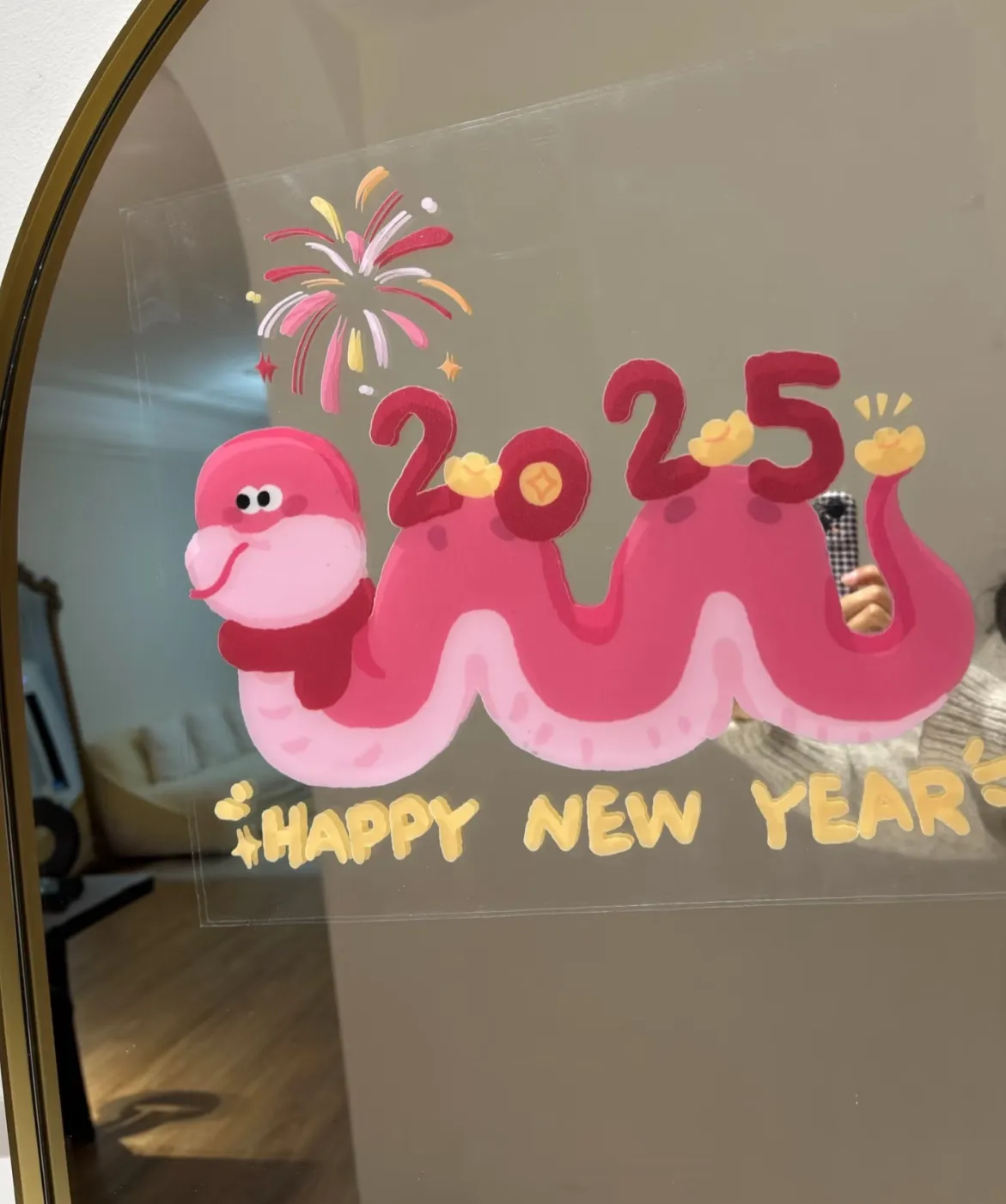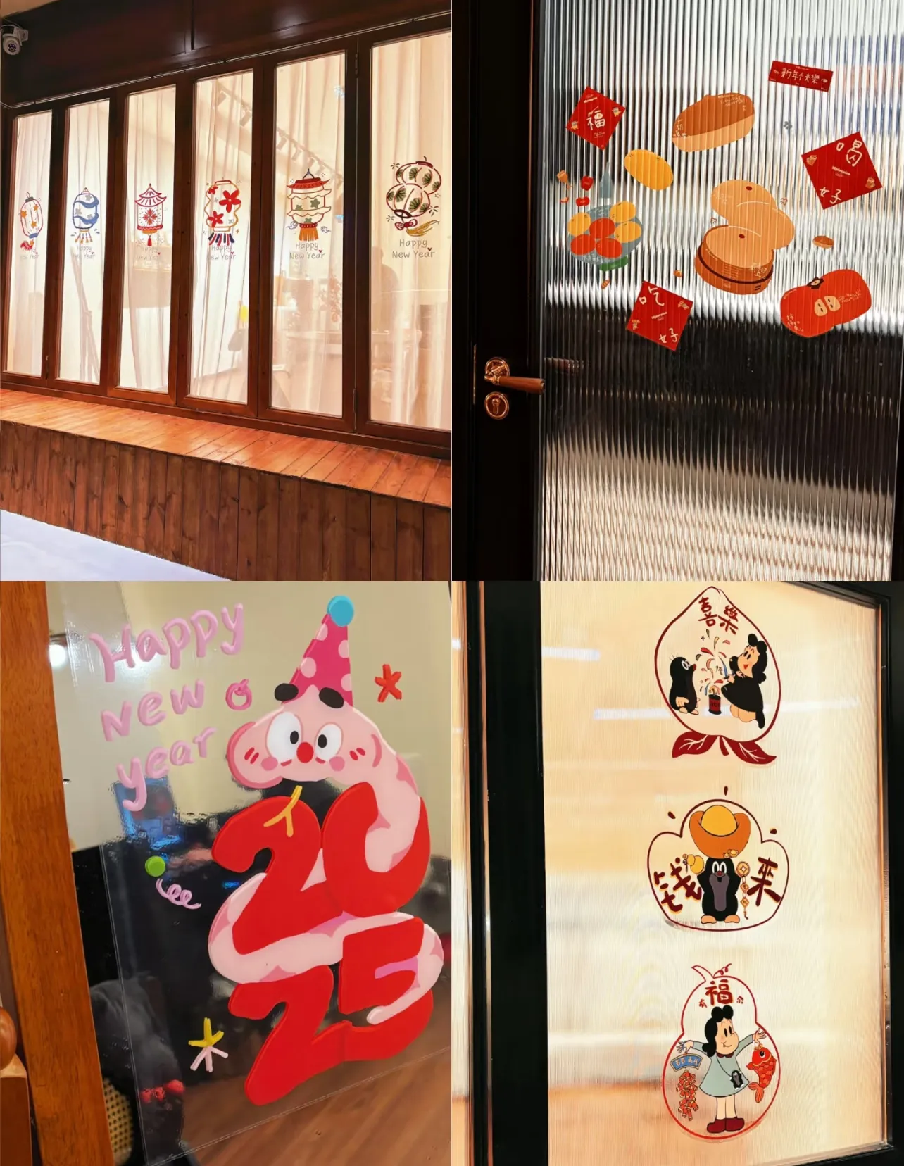 选完之后,拿回家,就可以不限地方的,给窗户上、冰箱上、门上、镜子上……只要是光滑的表面,就可以一顿贴贴贴,能极大程度上的,增加全屋的新年氛围感!