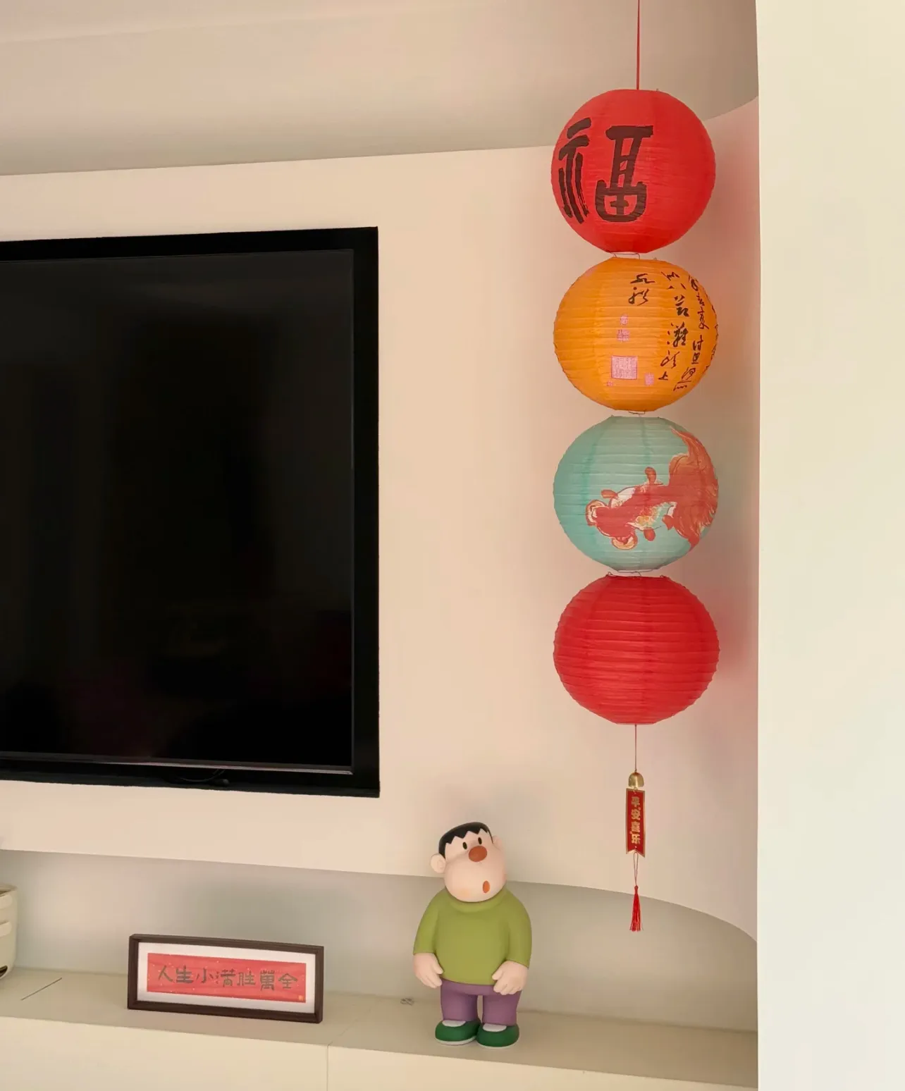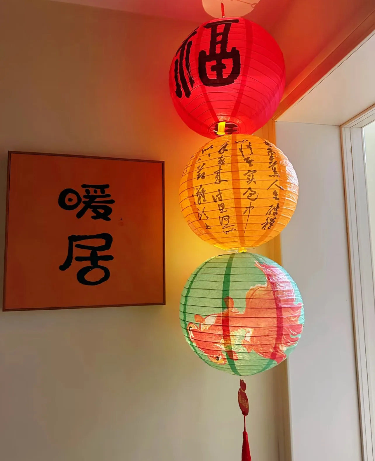 以前灯笼挂在大门口,现在我们没有大门,可以挂在家里,阳台、客厅,随手一拍就是满满的过年氛围感。