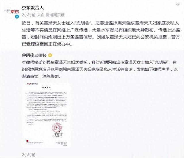 10月16日,京东发言人发文称,近日,有关章泽天女士加入“光明会”、恶意造谣抹黑刘强东章泽天夫妇家庭及私人生活等不实信息在网络上广泛传播,大量水军账号有组织地大肆散布、传播上述谣言,短时间内炮制出上万条谣言信息。刘强东章泽天夫妇已向公安机关报案,警方已受理该案且正在侦办中。