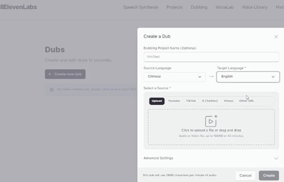 这里推荐使用llEleven语音生成网站,上传素材视频,选择源语言为中文、目标语言为英语,点击“create”生成英语音频。