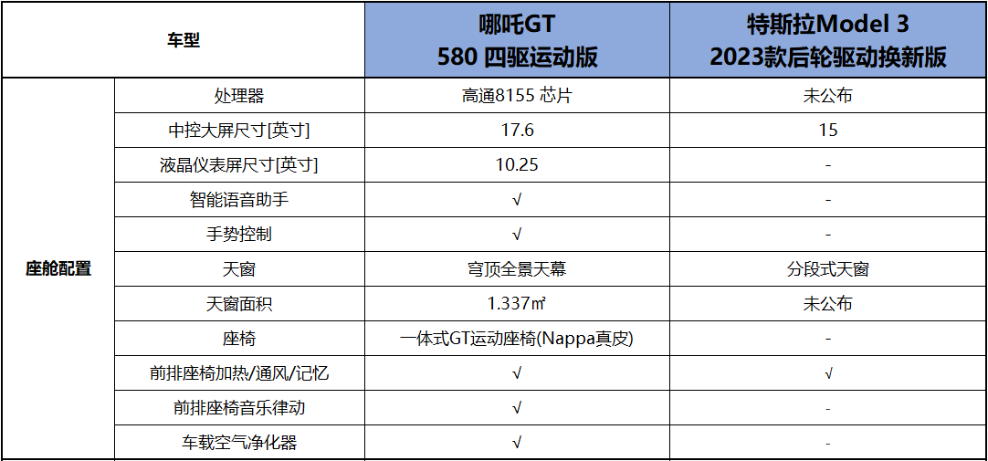 对比之下,Model 3的座舱配置略显“寒酸”。无论是座舱内的硬件配置,例如中控大屏的尺寸、座椅的舒适度等,还是智能化功能上,例如语音助手、手势识别等,均不如哪吒GT更为丰富。而且哪吒GT的功能还做到了真正贴合用户日常用车中的所思所想,让用户时时刻刻都能感受到哪吒GT为他们来带的不同的出行体验。