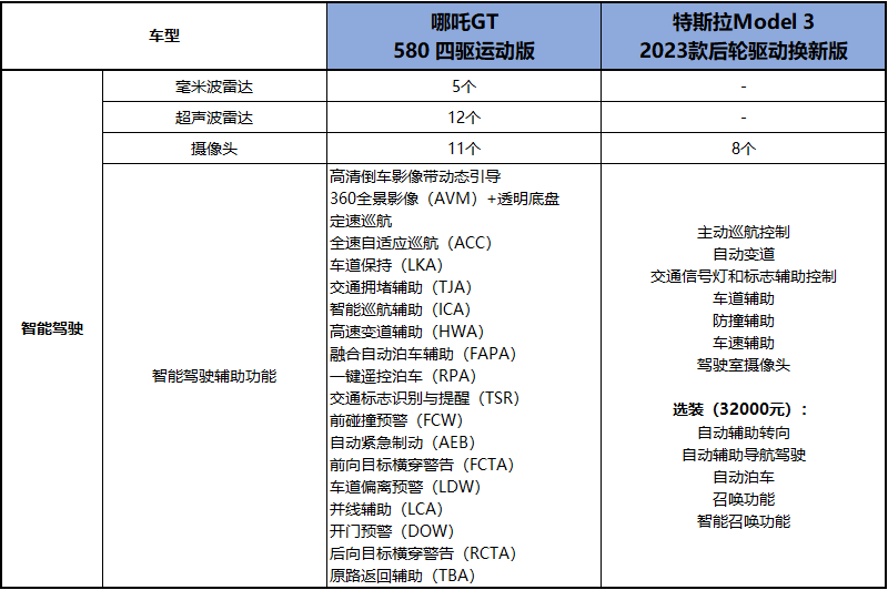 在智能驾驶辅助功能上,哪吒GT能够实现ACC全速自适应巡航、FAPA融合自动泊车辅助、LDW车道偏离预警等19项智能驾驶辅助以及主动安全功能。对比之下,Model 3上一些诸如自动辅助导航驾驶、车道变换、自动泊车之类的智驾功能,则是需要加购最低32000元的选装包才能实现。