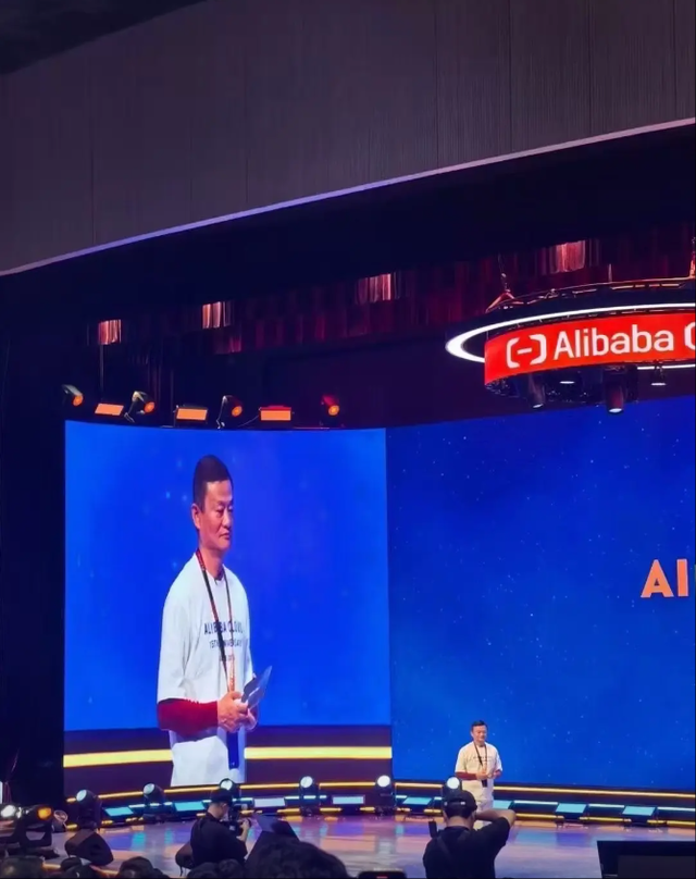 马云穿着一件印有 “阿里云 15 岁啦” 的白色 T 恤,脖子上挂着阿里全新设计的工牌,工牌上 “风清扬” 的花名十分显眼。