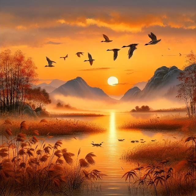 “落霞与孤鹜齐飞,秋水共长天一色。”—— 王勃《滕王阁序》落霞与孤雁一起飞翔,秋天的江水和辽阔的天空连成一片,浑然一色。