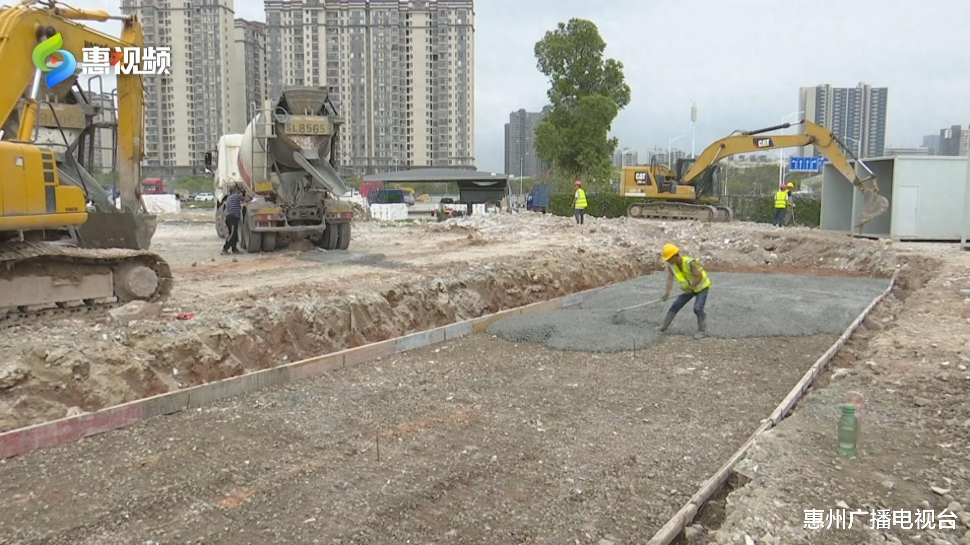 踏入施工现场,施工人员正操作着设备,利用水泥搅拌桩在做基坑支护工作,工程车辆往来穿梭,惠州市儿童公园里呈现一片热火朝天的建设场景。
