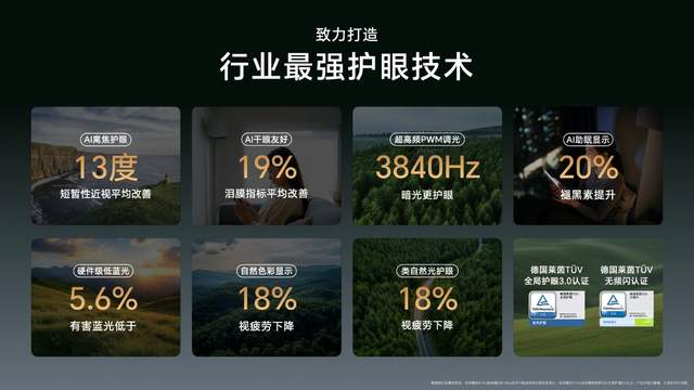 圆偏振光护眼技术有着“电子叶黄素”之称,它模仿自然光线的均匀分布,将传统屏幕的线偏振光转化为更接近自然光的圆偏振光,提高眼部叶黄素利用率,减轻视觉疲劳,给予用户如同自然光照般的舒适体验。而AI离焦护眼技术则结合了先进的离焦技术和图形算法,有效缓解视疲劳。