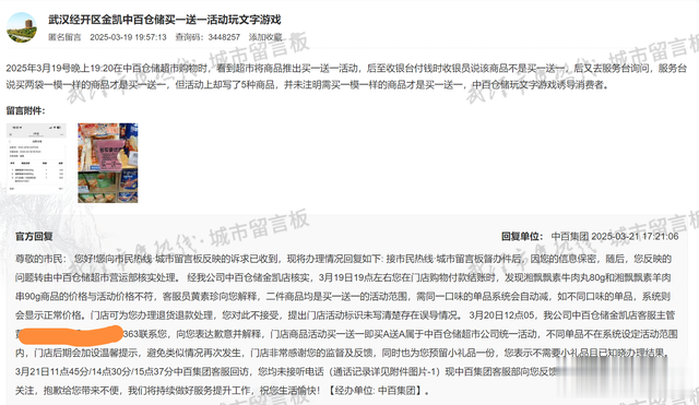 中百集团 2025-03-21 17:21:06官方回复尊敬的市民: 您好!您向市民热线·城市留言板反映的诉求已收到,现将办理情况回复如下: 接市民热线·城市留言板督办件后,因您的信息保密,随后,您反映的问题转由中百仓储超市营运部核实处理。 经我公司中百仓储金凯店核实,3月19日19点左右您在门店购物付款结账时,发现湘飘飘素牛肉丸80g和湘飘飘素羊肉串90g商品的价格与活动价格不符,客服向您解释,二件商品均是买一送一的活动范围,需同一口味的单品系统会自动减,如不同口味的单品,系统则会显示正常价格。门店可为您办理退货退款处理,您对此不接受,提出门店活动标识未写清楚存在误导情况。