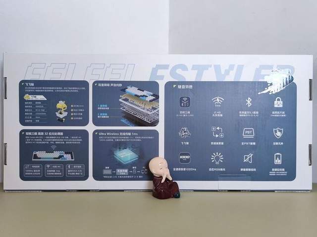 首先来看这款键盘的外包装,包装正面有键盘真实渲染图,熊猫滑雪图,以及关于这款产品的五大卖点,自主研发飞飞轴、双核三模链接、支持蓝牙连接、热插拔底座、动态RGB灯光,盒子的背面则详细介绍了这些卖点。