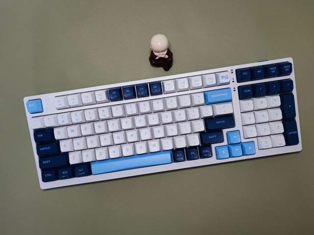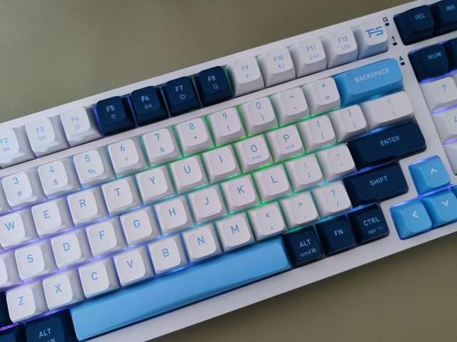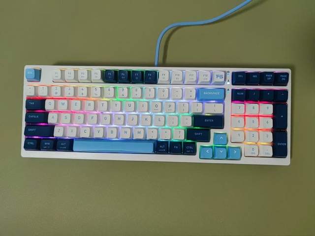 从正面看这款机械键盘,可以看到键帽的配色主要由白色、浅蓝、深蓝三种颜色组成,键帽采用双色一体注塑的PBT键帽,PBT分子材料具有结构稳定和耐磨损特点,避免了指尖的油脂附着在键帽表面油腻的情况出现,而且键帽采用了贴合指腹的凹面设计,这使得这款键盘更具人体工学设计,在操作时更加舒服。