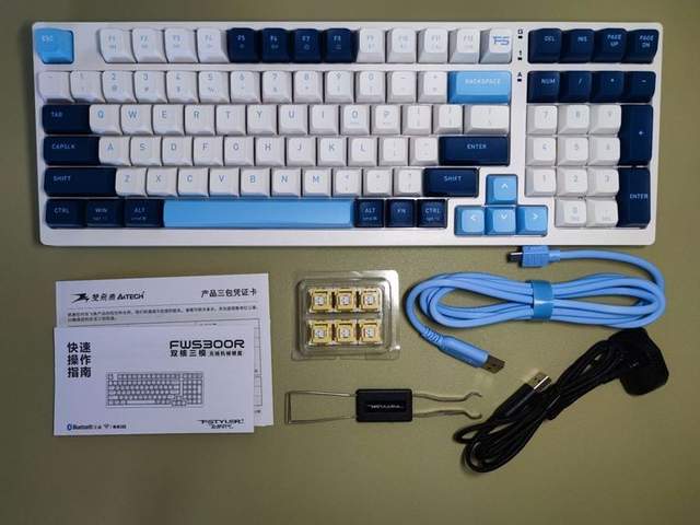 飞时代FWS300R无线机械键盘总共有三款不同主题颜色的键盘,我手里的这一款是飞飞滑雪版本的,此外还有飞飞潜水和飞飞攀岩两种不同主题,打开包装我们看一下都有哪些配件,键盘本体、拔键拔轴器、抗干扰延长座、type-c充电数据线、6颗可供替换的飞飞轴还有操作指南。