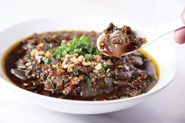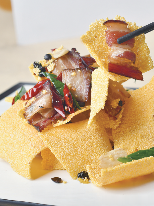 厨师做菜就是把主料、辅料、调料进行千变万化地组合,搭配好了就可能成为流行菜。普通食材易得,组合搭配难度更大,但也不乏一些巧妙之处,如油渣与红苕粉条组合,丝瓜与荷包蛋搭配,牛蹄筋与牛肉相伴,也能出彩。比如椒麻鸡,虽是传统川菜,但通过巧妙自制花椒油,让传统菜焕发新生命;又比如选用小米作为锅巴原料,再与腊肉相结合,产生了美妙的口感,在餐厅点击率很高;在炒鸡蛋中加入桃胶,口感软香之余还多了Q 弹。或取自当地食材,或源于民间制法,皆有可取之处。