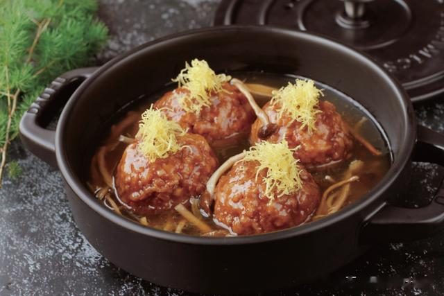2.净锅倒入大豆油烧至五成热,下入大丸子炸熟,捞出沥油。然后另入锅用鲜汤煲至外酥里软熟,取出来装盘。