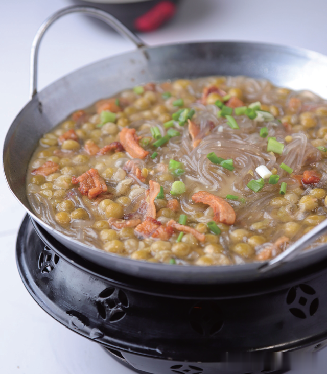 2.锅留部分油渣和熬出的猪油,放适量色拉油烧热,下入(火巴)豌豆和蒜米炒至翻沙,掺鲜汤烧沸,然后下入水发红苕粉条,调入盐、味精、鸡精、胡椒粉,用中火收浓入味,出锅装入煲仔锅内,撒上剩余的油渣和葱花即成。