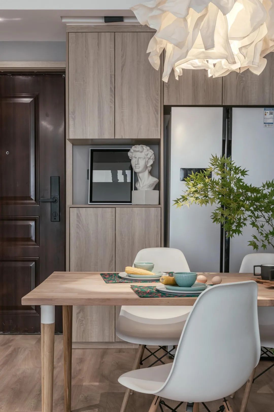 进门即是餐厅,没有独立的玄关,然而玄关的功能却不能少,入户左侧的一排定制柜在满足入户收纳的同时,还将冰箱嵌入其中,从而释放了厨房空间。