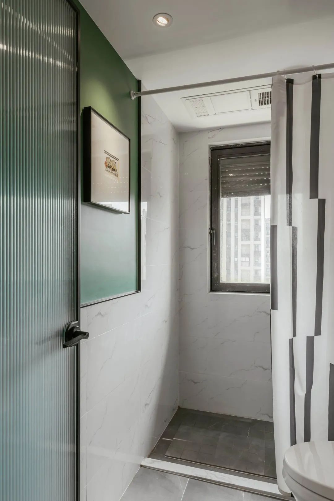 长虹玻璃门、窗帘的使用,在保证私密性的同时,也尽量避免了空间的局促感。色彩打破了空间的单调,注入恬静安宁的氛围感。