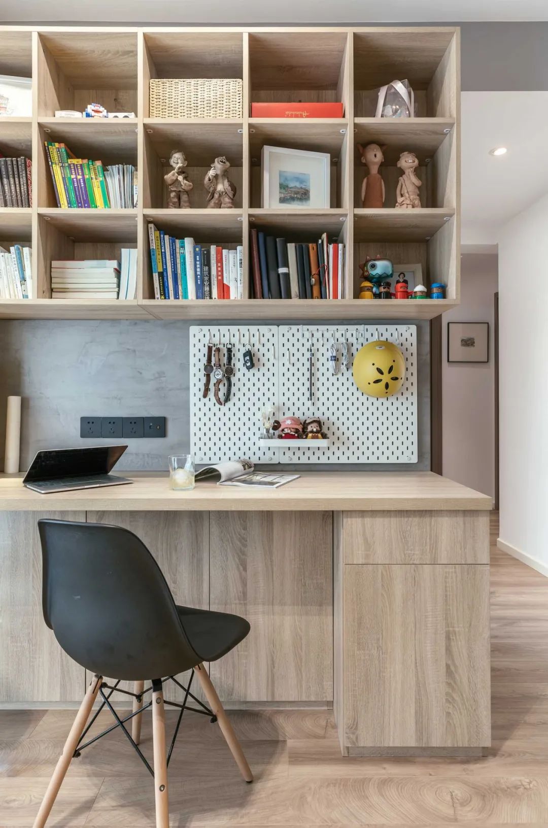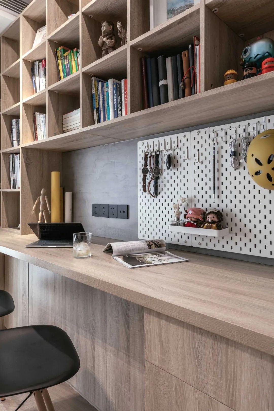 这套房子的客厅打破了常规的设计,在满足休闲的同时,兼具了办公、收纳等功能。