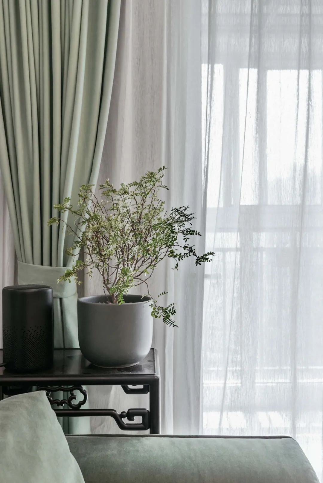敦实而舒适的灰绿色沙发,浅绿色的窗帘还有绿植,给人自然轻松的视觉享受。沙发旁边小钢琴,不占地方,却可以丰富家人的业余生活。