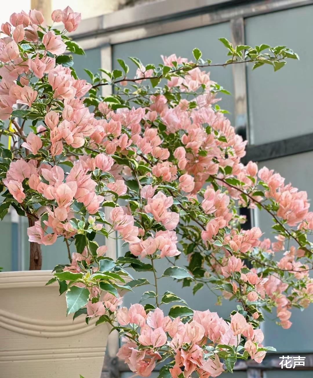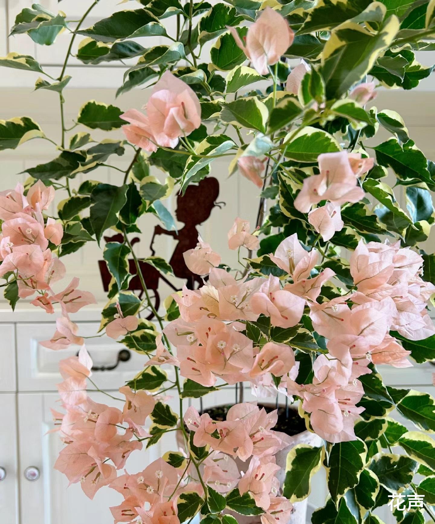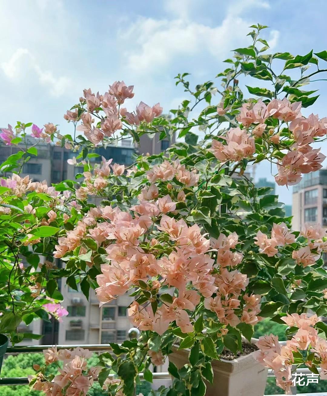 马斯是那种让人很舒服的三角梅。它的叶子是绿色带金边,叶艺明显,就算不开花也可观叶,花朵层次多,温柔的杏粉色,在阳光底下看,像是涂了一层荧光粉,金灿灿、闪亮亮的,“颜值”非常高,和绿樱、红樱比起来也不逊色,各具千秋特色。