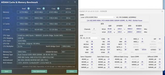 这套XMP 8000MT/s内存在微星MAG B850M MORTAR WIFI迫击炮主板上,读取达到59230MB/s,写入达到85788MB/s,延迟为75.3ns,此时为默认跑分表现,下面我们在看一下开启Memory Timing Preset内存一键小参优化功能后读写性能的变化,设置档位为好香(Relax)。