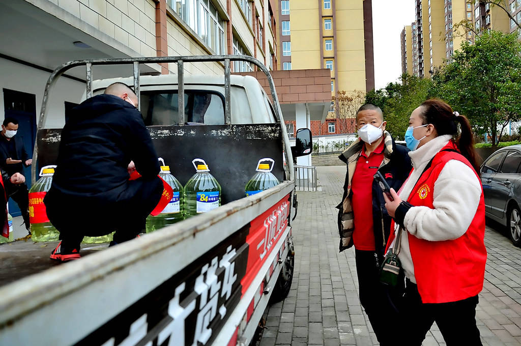 第三站,为天津路166号天四社区农专家属院送去消毒液,给居民一个安全的生活环境。