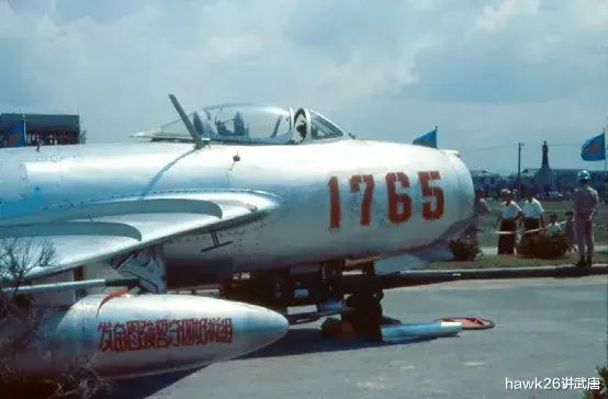 ▲1962年我军飞行员刘承司驾驶米格-15叛逃台湾,可见当时我军飞机涂装非常简单,在副油箱处写着“发愤图强誓夺四好机组”的激励性语句。