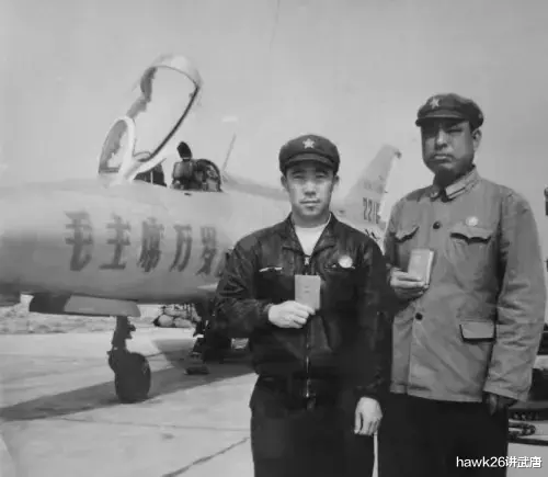 ▲歼-7机鼻处涂写的“毛主席万岁”标语,飞机前两人手里拿着红宝书。