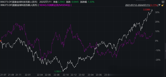 人民币份额近1年/3年/5年都跑赢了纳指,在整个QDII主动权益基金中,他是唯一一只。