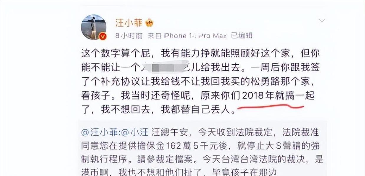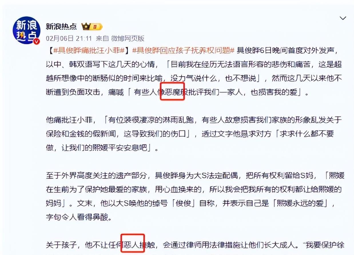 具俊晔或难赢得抚养权虽然后来具俊晔把关于孩子那段内容删掉了,还解释说,关于孩子的财产问题,他希望能有律师在场,好好保护孩子的利益。不过呢,他毕竟只是孩子的继父,要是真要争抚养权的话,他跟汪小菲这个亲爸比起来,胜算还是没那么大。