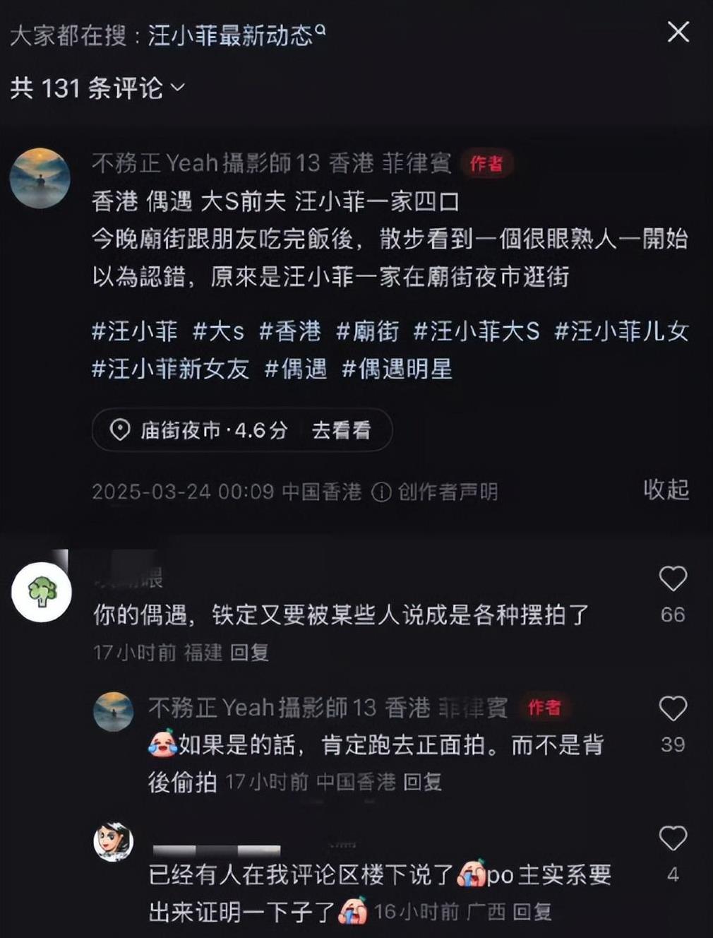 汪小菲携家人现身香港夜市最近啊,汪小菲带着马筱梅还有他家的姐弟俩一起去香港玩了。有一天晚上他们在夜市的时候,被一个网友给碰上了。那天呢,他们一家四口都穿得很 casual(休闲),感觉特别放松。四个人一起出现的画面特别和谐,看起来特别温馨。这个时候啊,那两个孩子好像暂时忘掉了之前的不开心,好好地享受了一段轻松的时光。