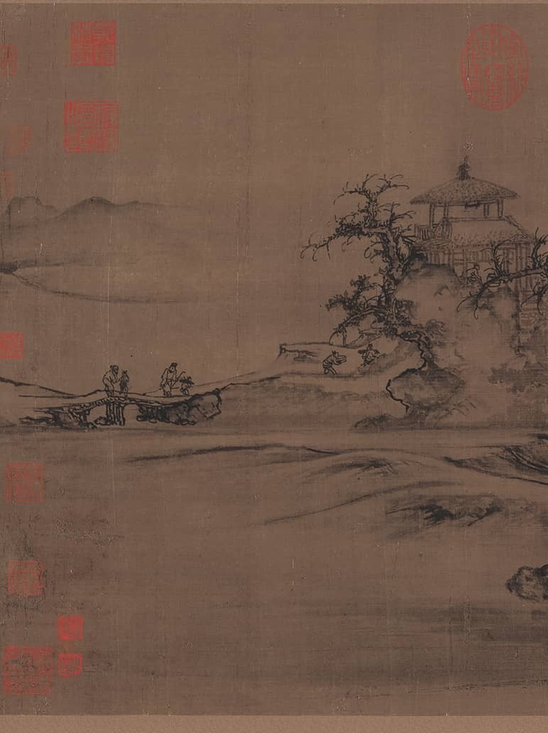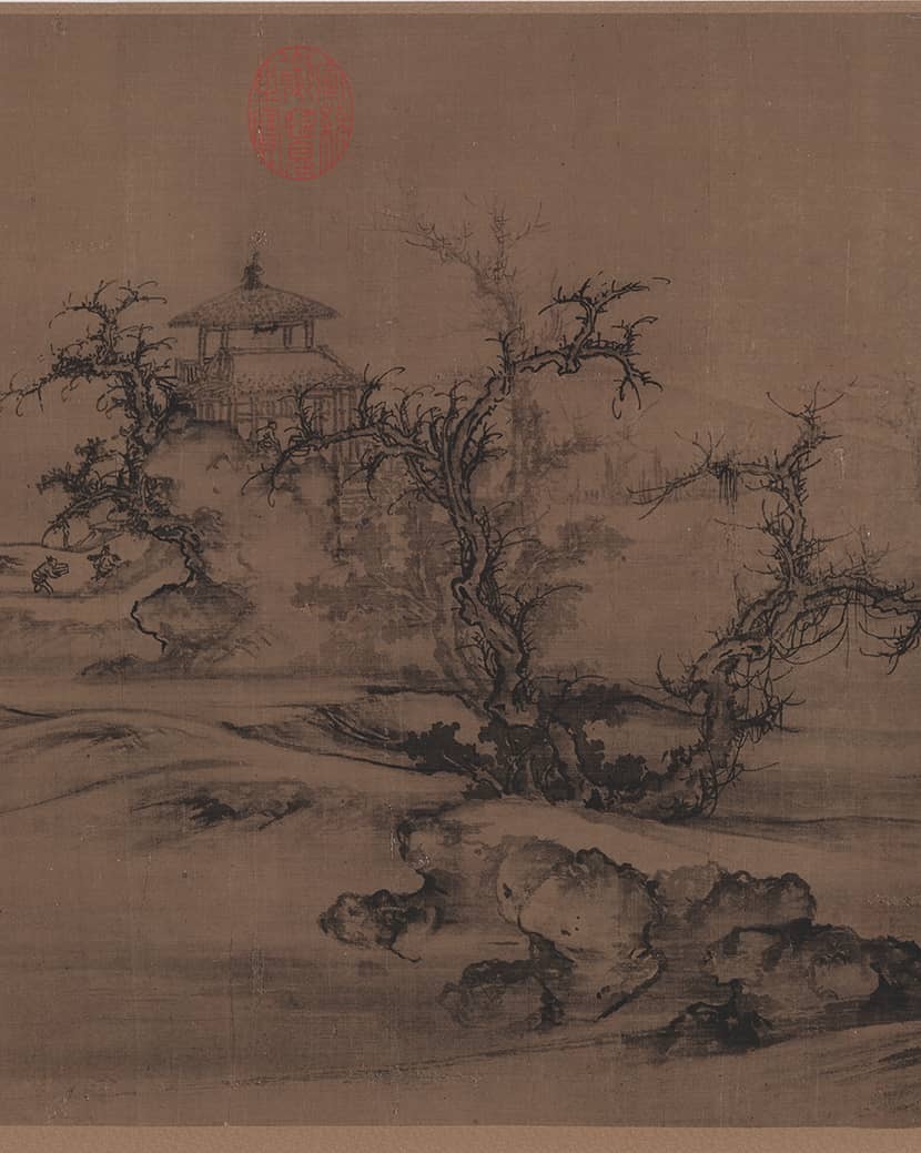 十一世纪晚期著名的山水画家郭熙致力于用具体的形态表现诗意的画面和情感,他尤其钟爱传达季节和时间的微妙之处。《树色平远图》是经典的“平远”画法之变体,平远画法中前景常有大树,背景则是宽阔的河谷。这幅作品可能是画家在退休前夕为同僚所作的晚期画作。在手卷的末端,秃树和浓雾使画面笼罩在凄凉的秋色中,两位老者向凉亭走去,或许是要与同事一起送别朋友。