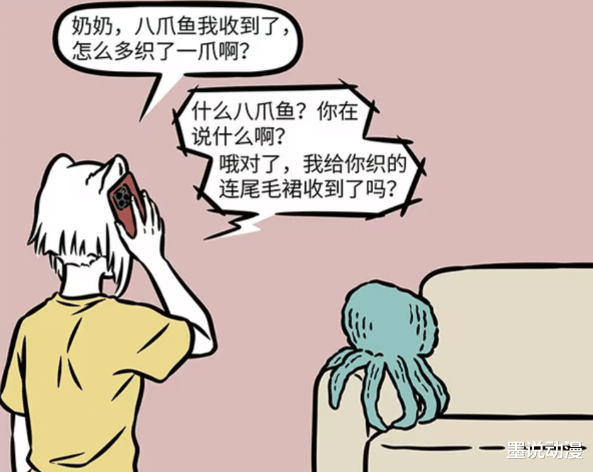 九月收到礼物之后,还是给奶奶打了电话。九月告诉奶奶,礼物她收到了,可是为什么八爪鱼会多一爪。奶奶也是很疑惑,什么八爪鱼?她没送过这种东西。奶奶送过来的是连尾毛裙,也就是为九条尾巴量身定制的针织物。