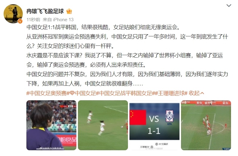赛后,知名体育媒体人冉雄飞就将矛头对准了主教练水庆霞,冉雄飞声称中国女足从亚洲杯冠军到如今的奥运会预选赛失利,仅仅用了1年的时间,并且这一年内,水庆霞带队接连输掉了世界杯小组赛、杭州亚运会以及奥运会预选赛,这三大赛全部以失利告终,冉雄飞认为必须要有人出来承担责任,而这个人显然就是主教练水庆霞