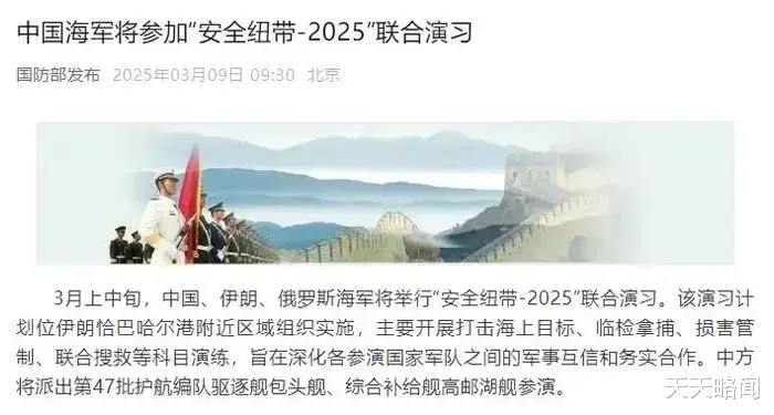 特朗普政府放出消息呼吁盟友联手封锁马六甲海峡后,3月9日中国国防部宣布3月上中旬,中国、伊朗、俄罗斯海军将举行“安全纽带-2025”联合演习。
