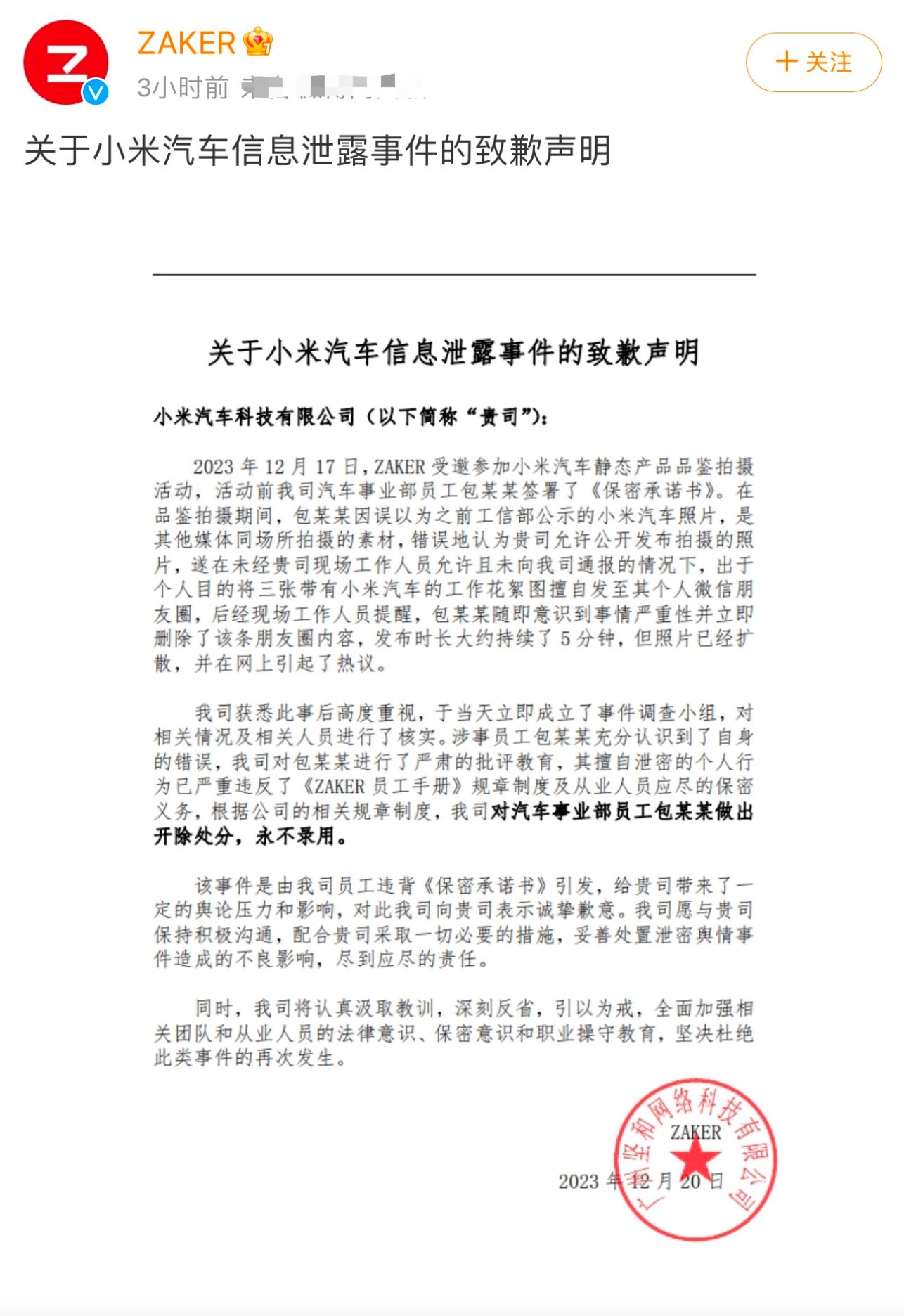 小米本身就是做互联网发家的,所以大家也就信了这些黑子的话。但是随着事态影响越来越大,小米直接就发布了公开声明,而且相关泄密的媒体也发布了致歉声明。从这份致歉声明也能看到,公司不仅是对违反员工进行了严肃的批评教育,而且还做出了开除处分,永不录用的结果。