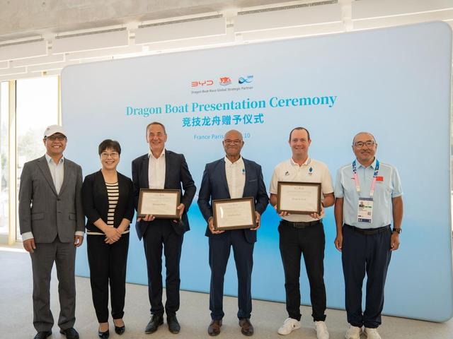 本次在巴黎,比亚迪除了参与到龙舟表演赛之外,更将3艘符合国际标准的竞技龙舟分别赠送给了国际皮划艇联合会、欧洲皮划艇协会、法国皮划艇协会。这3艘龙舟承载着比亚迪对龙舟运动的热爱与支持,以及对体育文化交流的友好态度,远渡重洋,落户巴黎,并将用于三家组织的日常训练及国际文化交流体验。比亚迪希望通过赠送竞技龙舟这一实际行动,激发更多人对龙舟运动的兴趣与热爱,为推动龙舟运动的全球化发展贡献一份力量,更为国际文化交流添砖加瓦。