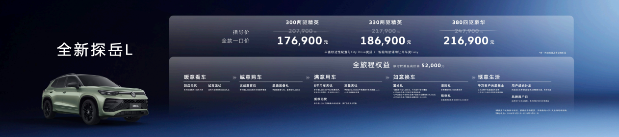 探岳L共推出 300TSI、330TSI、380TSI 三种动力配置共 3 种车型,官方指导价 20.79 万元起,可选装舒适性配置丰富的 City 包和驾驶辅助功能 Easy 包。现在购买全新探岳L,还将享受 17.69 万元起的全款一口价。2018 年至今,一汽-大众 SUV 家族累计销量已近 200 万辆,构建了产品数量最多、覆盖领域最广、兼具油电的 SUV 产品矩阵。为感恩千万用户一路同行,值明星 SUV 全新探岳L 焕新之际,一汽-大众还发布了全新IP“探山揽岳”,推出了全新探岳L 的上市权益大礼包,覆盖用户看车、购车、用车、换车等全旅程,总价值超 5 万元,诚意满满。