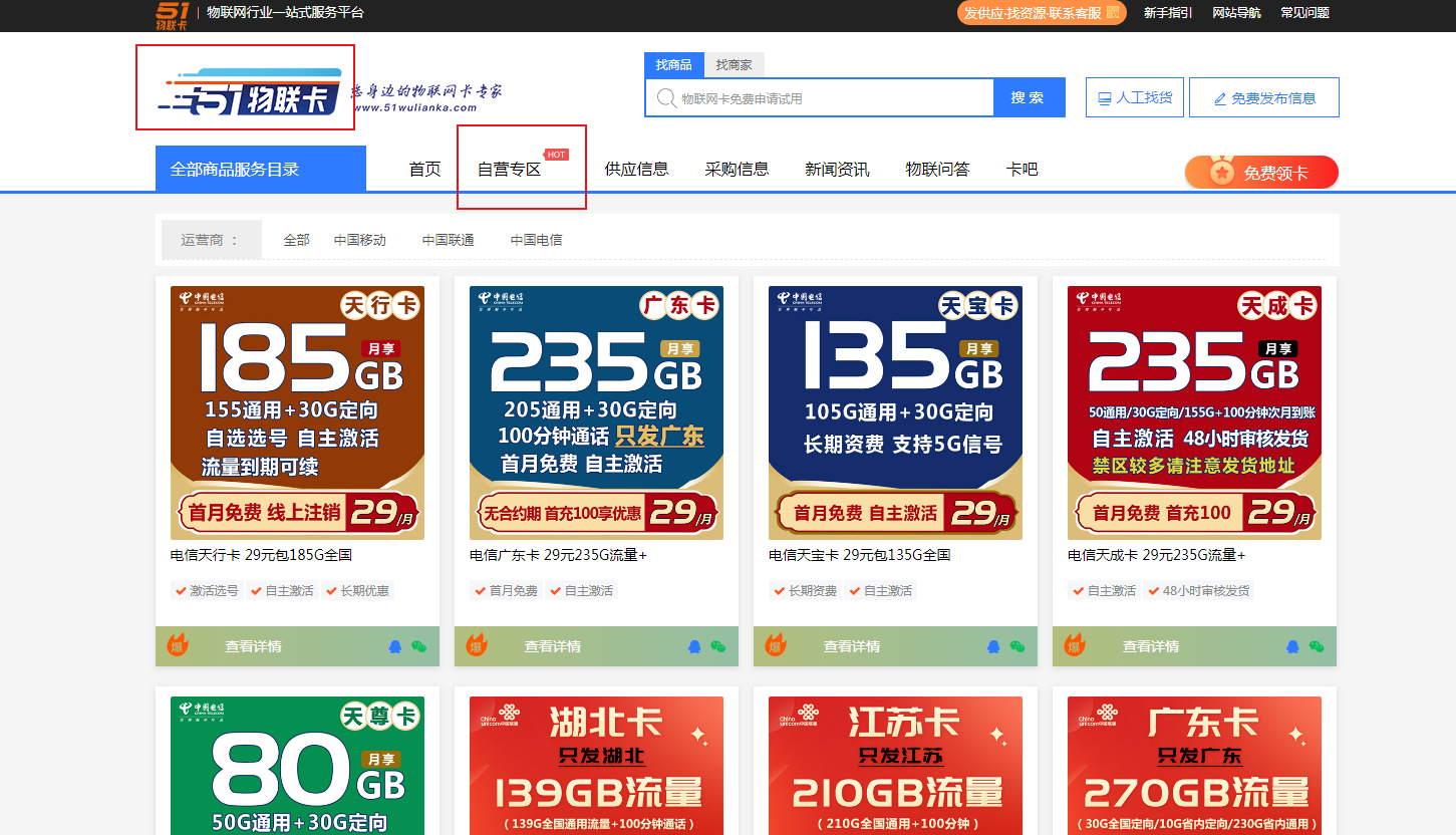 步骤2、选择对应的运营商和适合你的套餐,并免费领取。