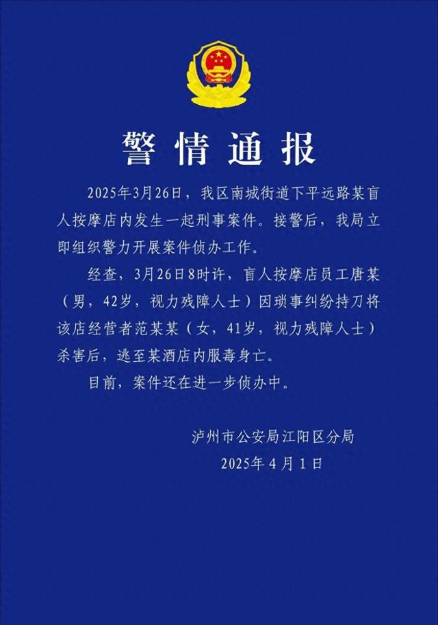 四川泸州江阳区一间不足20平米的盲人按摩店里,42岁的员工唐某持刀刺向41岁的店主范某某。